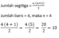 Kalau bangun membentuk segitiga tangga dengan jumlah baris = n, maka rumus cepat yang bisa digunakan adalah: